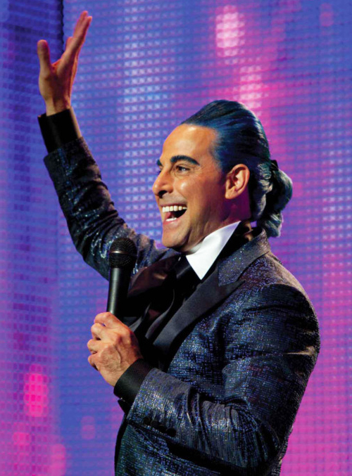 Hunger Games 04At the Capitol, they are assigned a stylist, Cinna (Lenny Kravitz) and they are introduced to the citizens and President Snow (Donald Sutherland) in a parade of chariots.  Cinna has designed special costumes for them that leave a trail of fire as they blaze up a gigantic arena for the presentation.  Katniss gets her nickname “The Girl on Fire” from the Master of Ceremonies, Caesar Flickerman (Stanley Tucci).  They begin their physical training and meet the other participants.  Districts 1 and 2 are more affluent than the others and spend a great deal of time and effort training their young so they are more equipped to win the games.  Their representatives are Marvel (Jack Quaid), Glimmer (Leven Rambin), Cato (Alexander Ludwig), and Clove (Isabelle Fuhrman).  The strongest is Cato.  During their final demonstration before they are given grades, Katniss misses her target and finds herself ignored by the Game Master, Seneca Crane (Wes Bentley), and sponsors.  To get their attention, she fires an arrow into their midst, neatly skewering an apple from a roast pigs mouth and pinning it to the wall.  She receives an 11, the highest grade of all of the contestants.